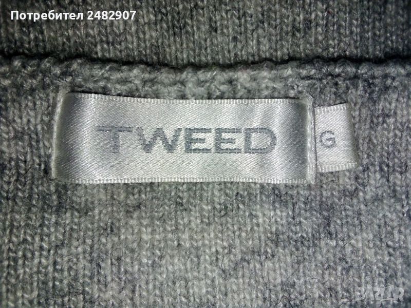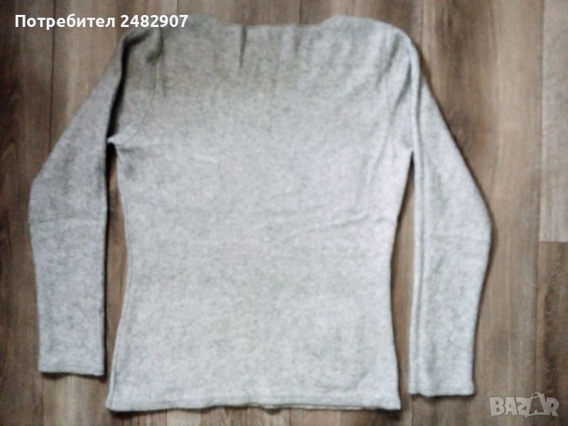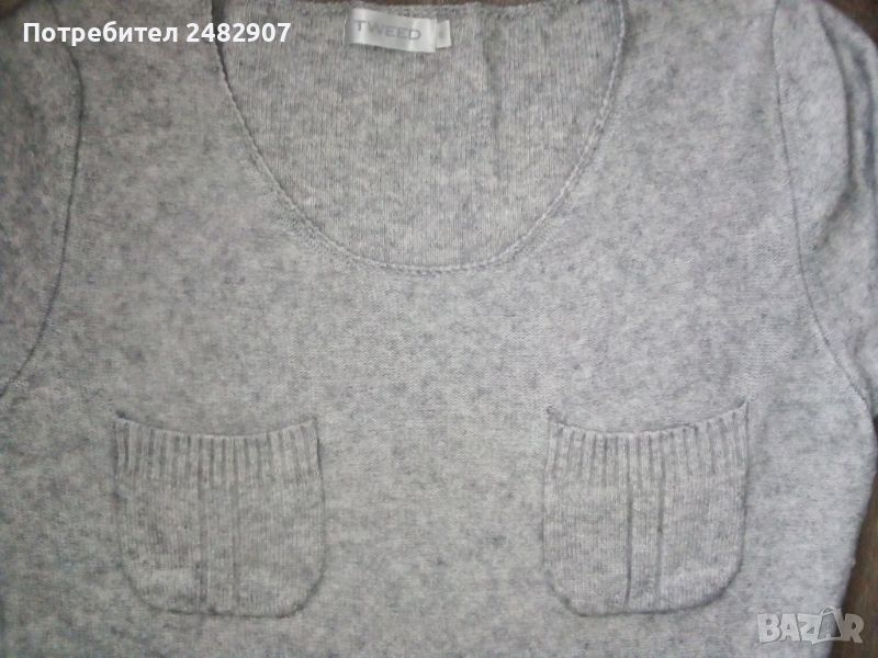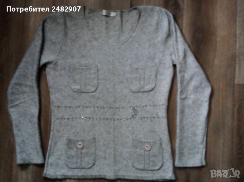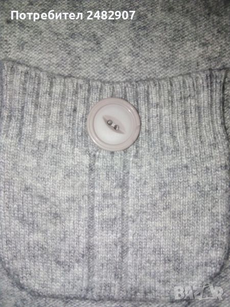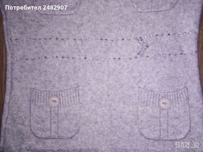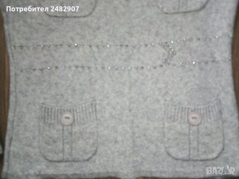 кашмирена вълна. Ширина в раменете - 37 см, ширина под мишниците - 48 см, ширина в долната част - 47 см, дължина от рамото до долу - 63 см, дължина на ръкава от рамото - 62 см, ширина на ръкава в долната част - 11 см. Чисто нова, не е използвана, с четири джоба отпред и имитация на колан от блестящи камъчета. Много мека, тънка и приятна на допир.