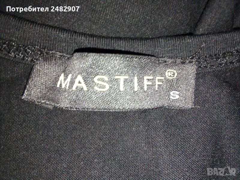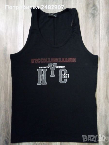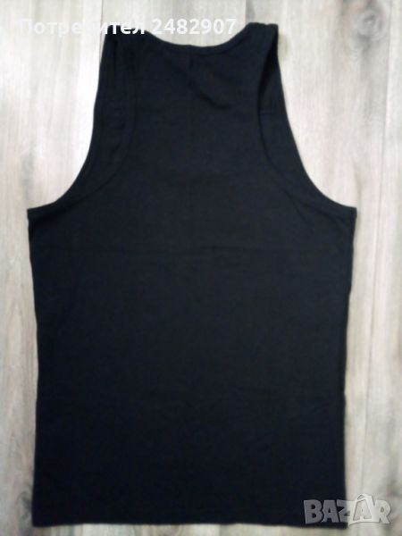 Черен мъжки потник с щампа, размер S. Съдържа 95 % памук и 5 % ликра. Ширина в раменете - 24 см, ширина под мишниците - 45 см, ширина в долната част - 44 см, дължина от рамото до долу - 69 см. Чисто нов, не е използван.