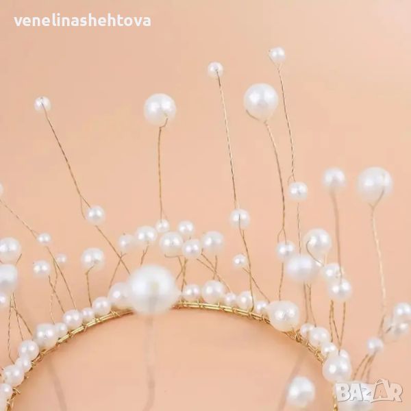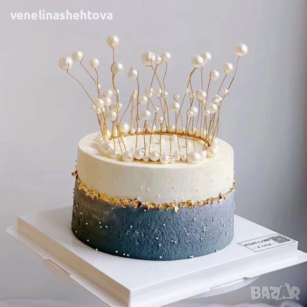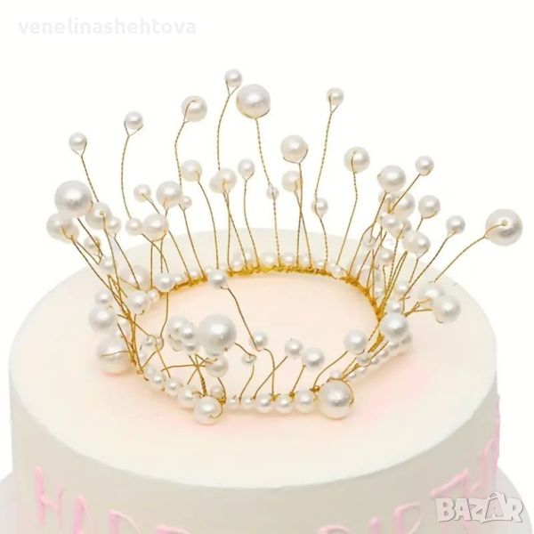 Златиста корнока тиара с бели перли за декорация на торта → Обява 46008078