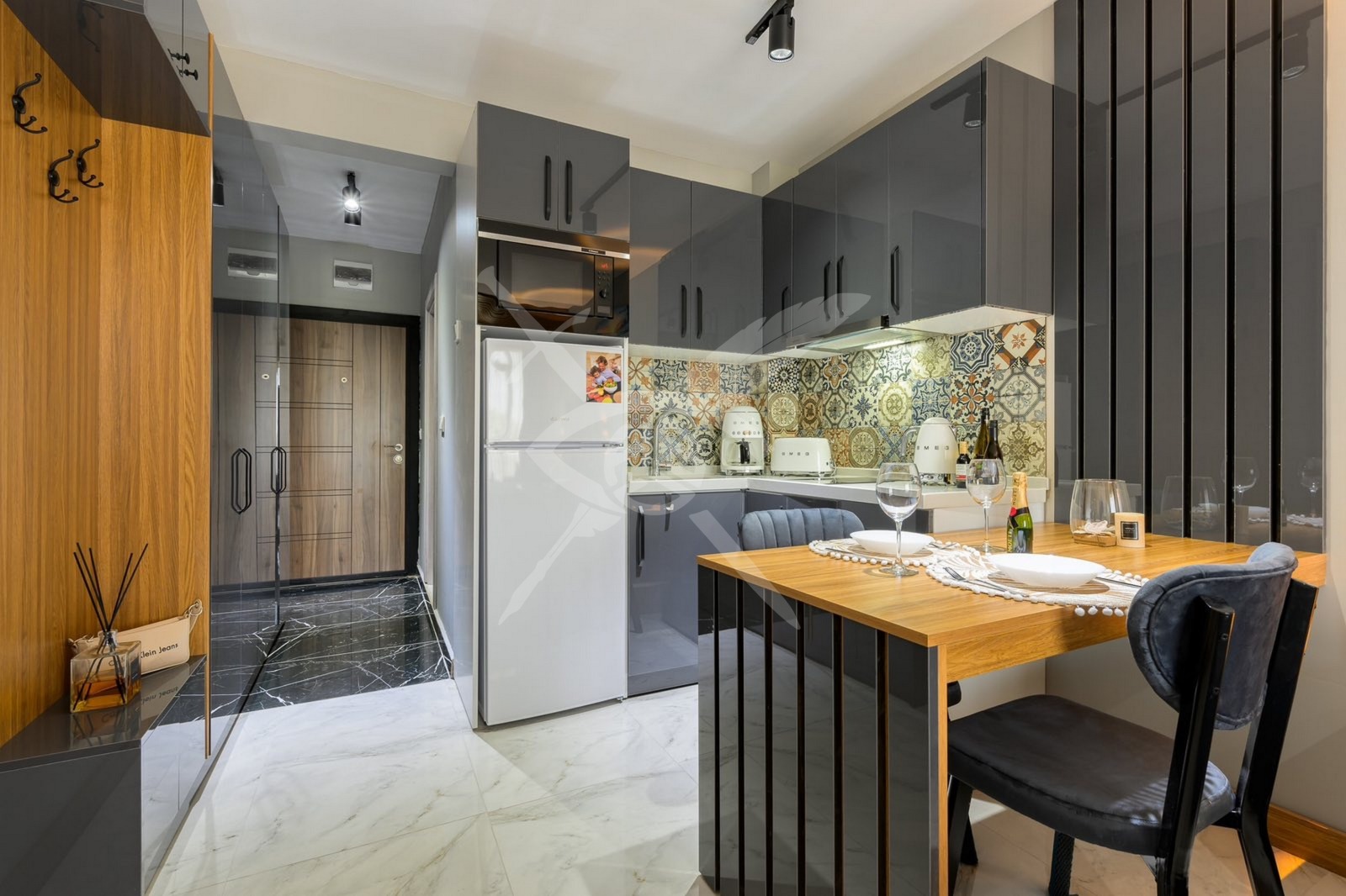 РАЗПРЕДЕЛЕНИЕ: Жилището разполага с площ от 39 кв.м., разпределена във входно антре, еднопространствено помещение с обособен кухненски бокс и спален кът, баня с тоалетна и тераса.