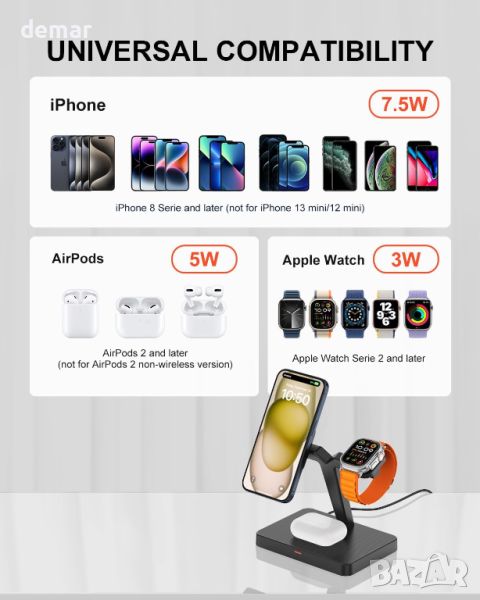 Стойката с безжично зарядно разполага с три точки за зареждане за вашия iPhone, Apple Watch и AirPods, като поддържа пространството ви свободно. Съвместим е със серия iPhone 12/13/14/15, iWatch Ultra 9/8/7/SE/6/5/4/3/2 и AirPods 3/2 Pro. Бързото безжично зарядно устройство, съвместимо с MagSafe, може да зареди iPhone 15 Pro Max от 0% до 100% за 3 до 3,5 часа, с мощност от 7,5 W за iPhone, 5 W за слушалки и 3 W за iWatches. Осигурява безопасно зареждане през нощта със сертификати CE, RoHS и FCC и множество защитни механизми. Удобният за потребителя дизайн включва силиконова подложка за предотвратяване на подхлъзване и мека дишаща светлина, която може да се изключи, за да се избегнат смущения.