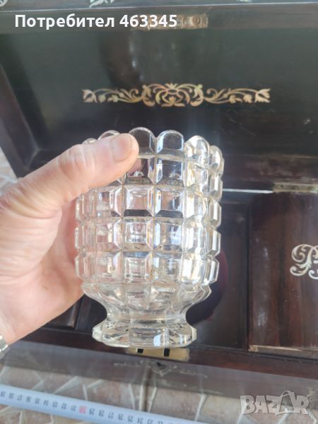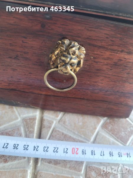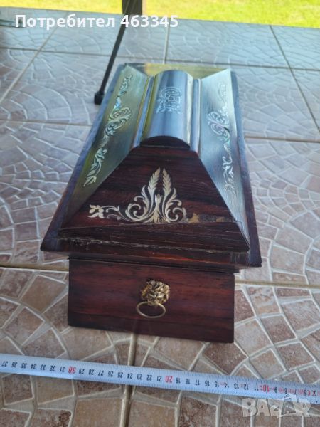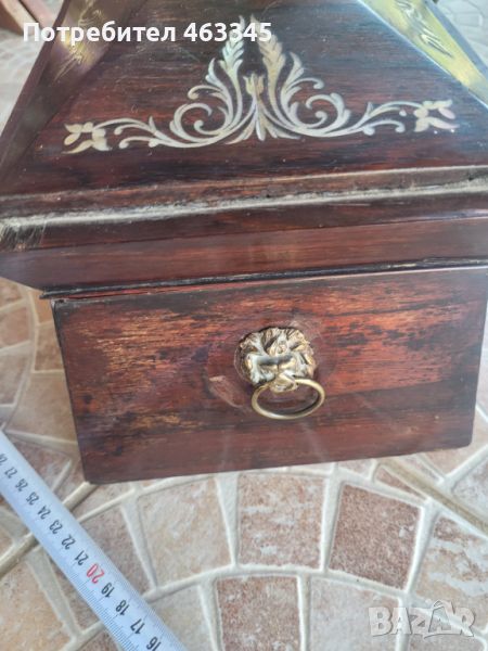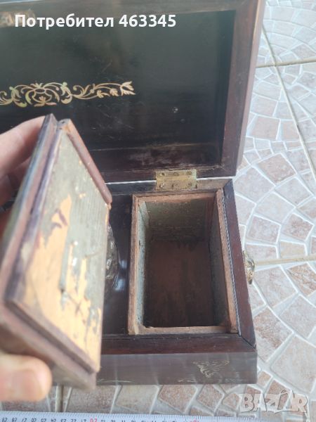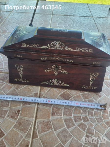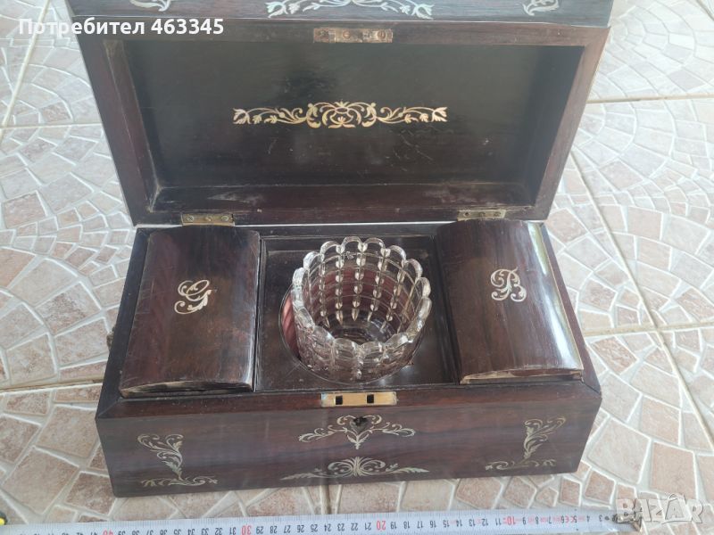 Страхотна кутия за чай от Викторианската епоха. Направена от махагон и украсена със седеф. Има три отделения. Средното съдържа чаша от дебело стъкло. Двете крайни отделения имат капачета с монограм J и B изписани с инкрустиран седеф. Седефена инкрустация и по вътрешната страна на капака на кутията. Голяма красота