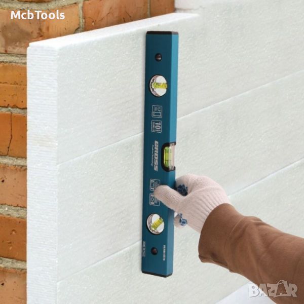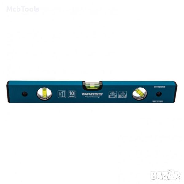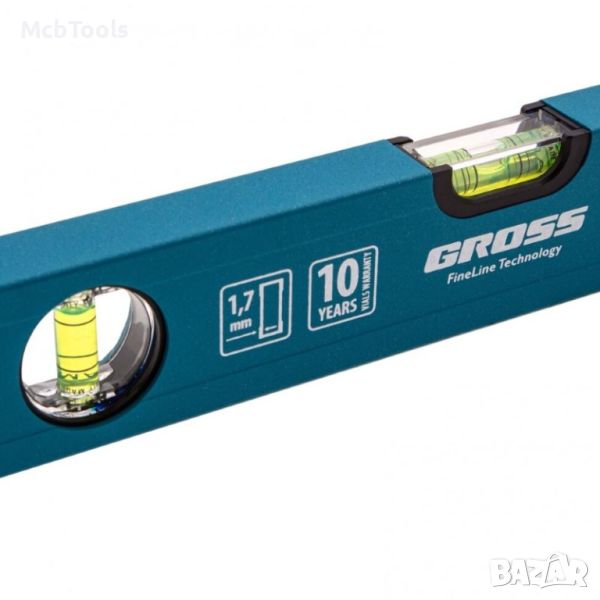 Алуминиев нивелир GROSS има 1 хоризонтална, 1 вертикална и 1 допълнителна либела 45°. Подходящ е за работа на тавани, носещи конструкции, склонове и покриви. С висока устойчивост на екстремни натоварвания. Изработен е от усилен алуминиев профил, с дебелина 2 мм.
