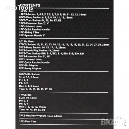 - 17х Накрайници (30L): SL8, 10, 12, T40, 45, 50, 55, 60, PH3, 4, PZ3, 4 HEX, 7, 8, 10, 12, 14 мм