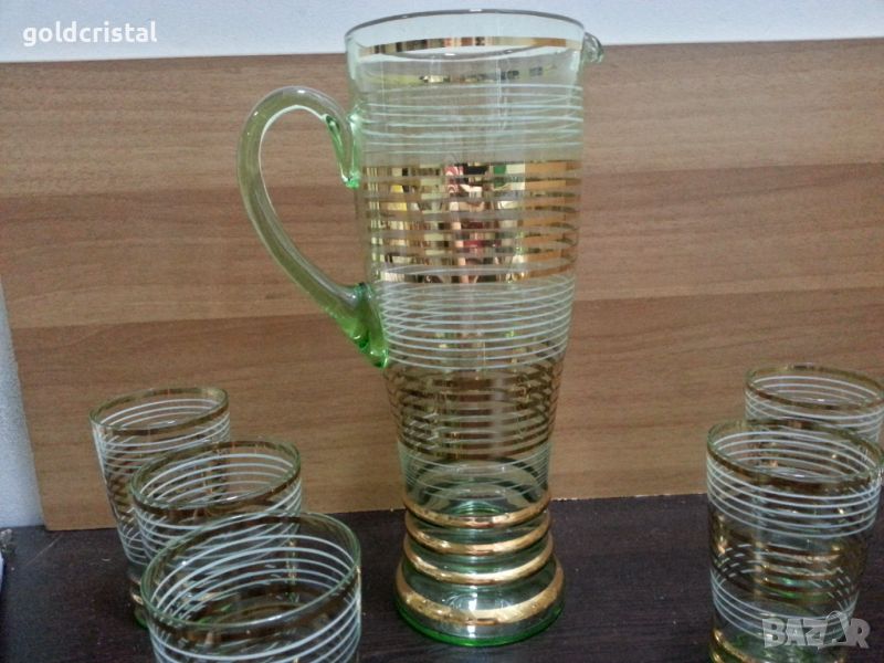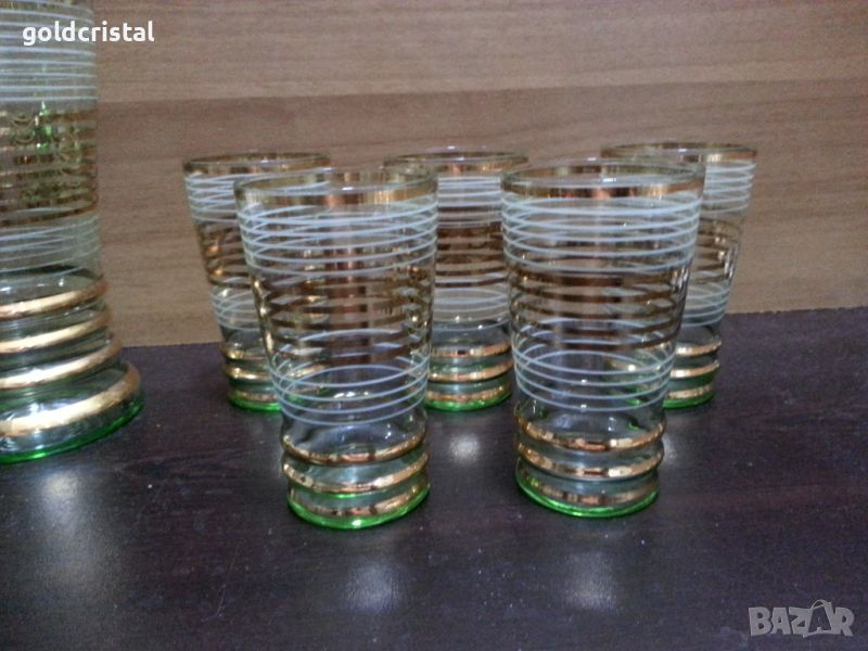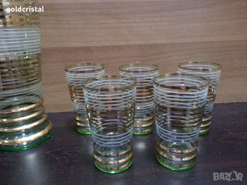 Стари стъклени чаши и кана златни кантове цветно зелено стъкло без забележки сервиз комплект сет лот ретро арт декор винтидж колекция стари старинни антикварни предмети обзавеждане за дома и семейството подходящи за подарък за ценители и колекционери