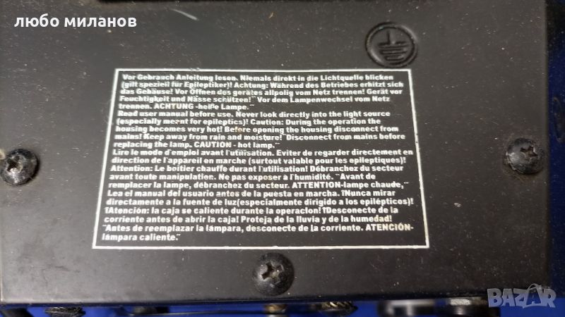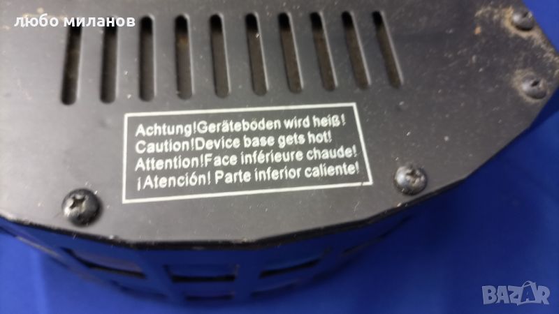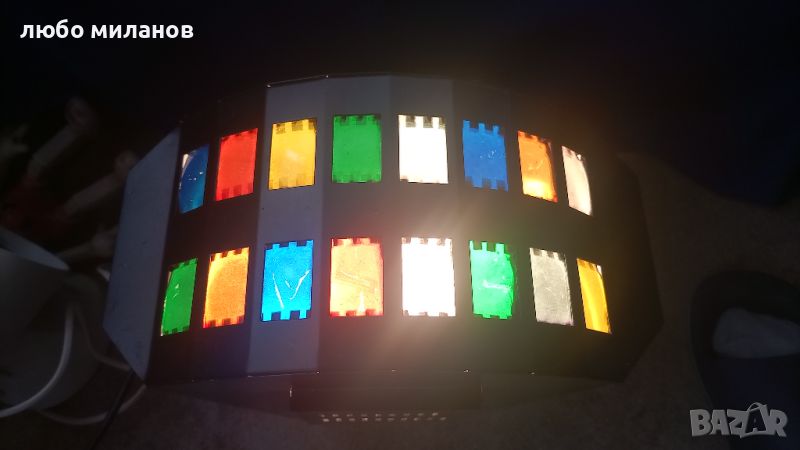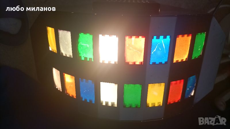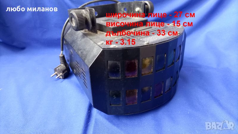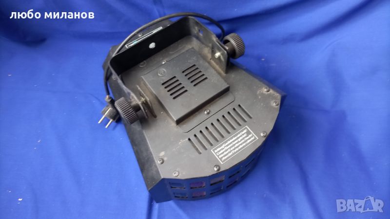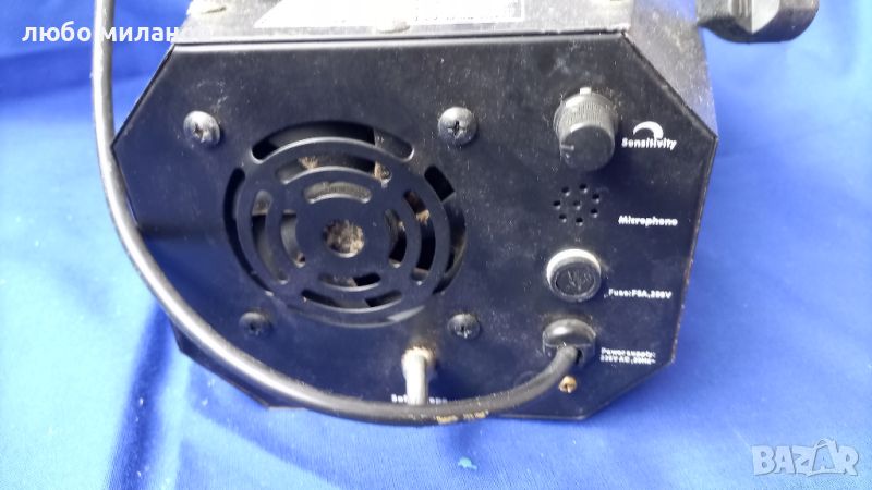 Продавам този прожектор в много добро състояние. Когато се запусне започва вътре да седвижи моторче, което по принцип трябва да променя посоката на осветителните лъчи според музиката. Явно обаче има нещо, което трябва да се пипне, защото моторчето спира след теста и повече не работи. При следващото запускана, пак същото. Предполагам нещо с микрофона му. Иначе свети постоянно и ако не се прави, ще си е осветление. Цената е съобразена с това. Вентилатора работи коректно, без излишни шумове. Всичко е на