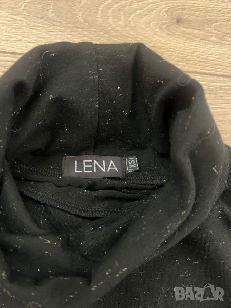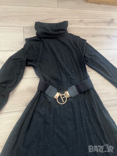 Плътна черна рокля със златисти нишки. Свободен модел, с поло яка. Предлага се без колана. Без забележки.