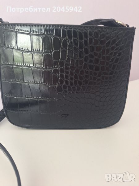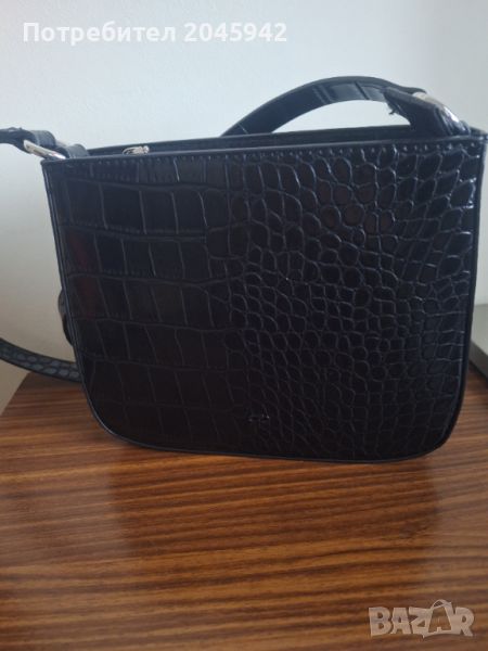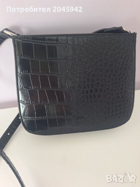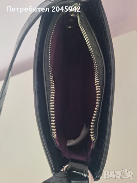 Черна кокетна , лачена чантичка- Pronta. Размери: дължина-17 см. ширина-20 см. Лилав хастар ,регулируема дръжка.
