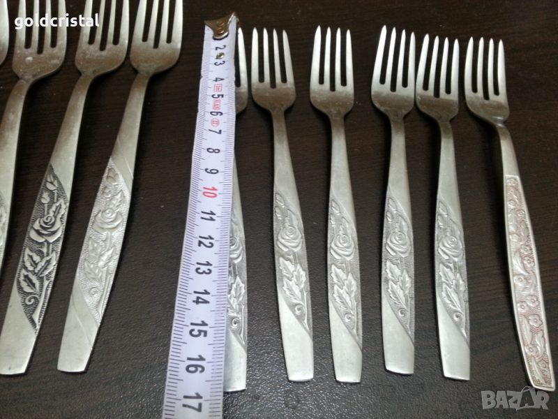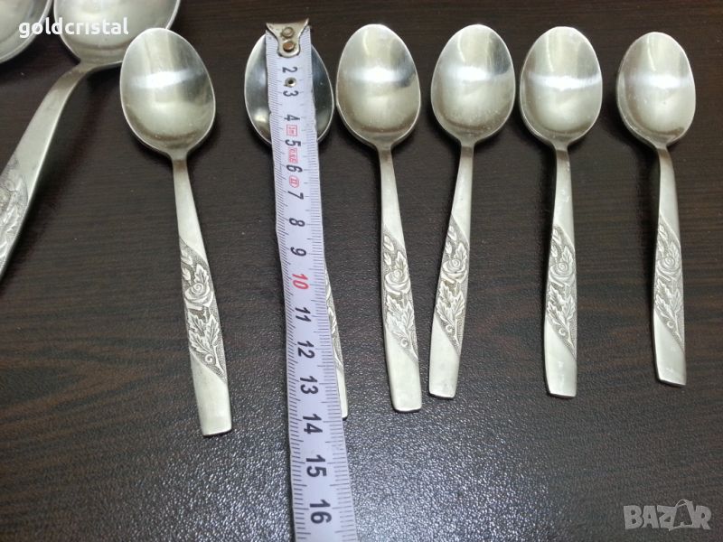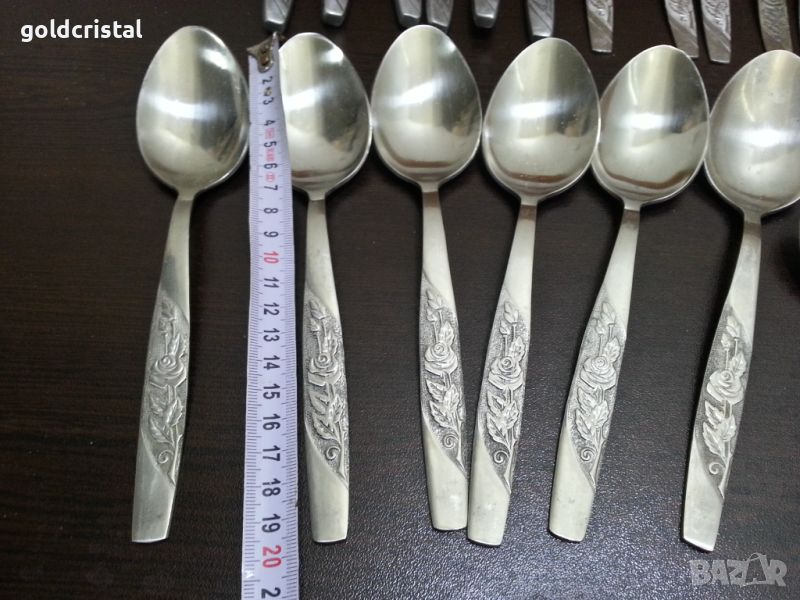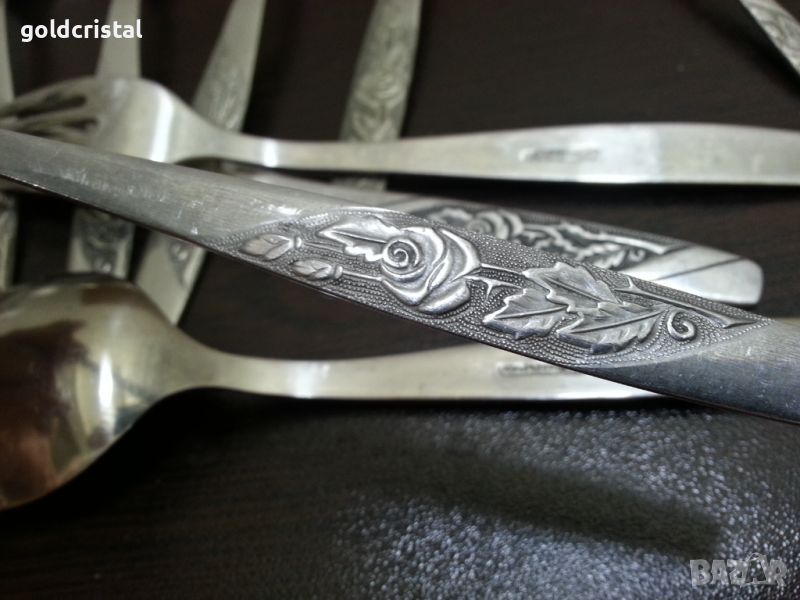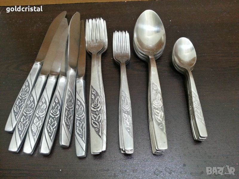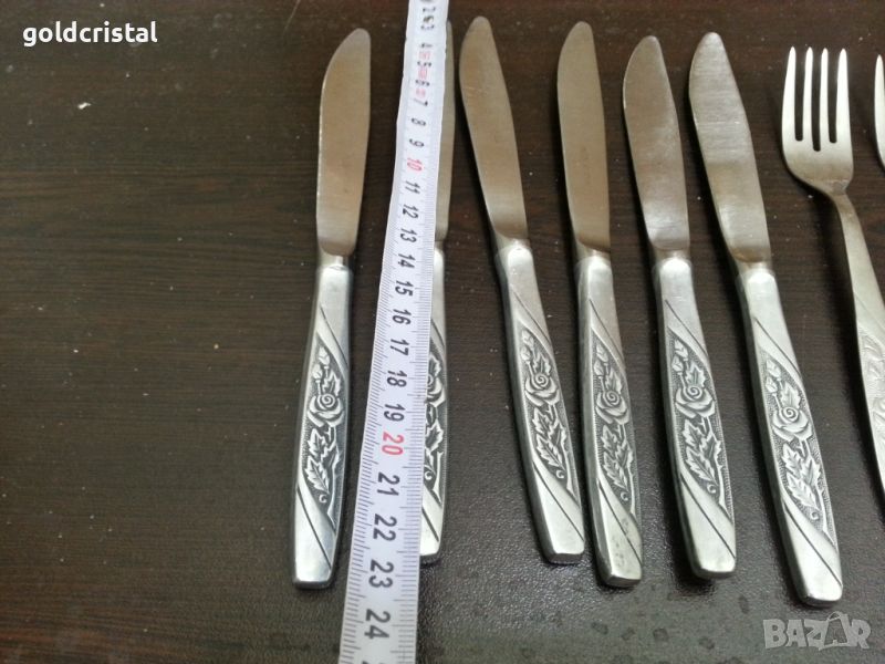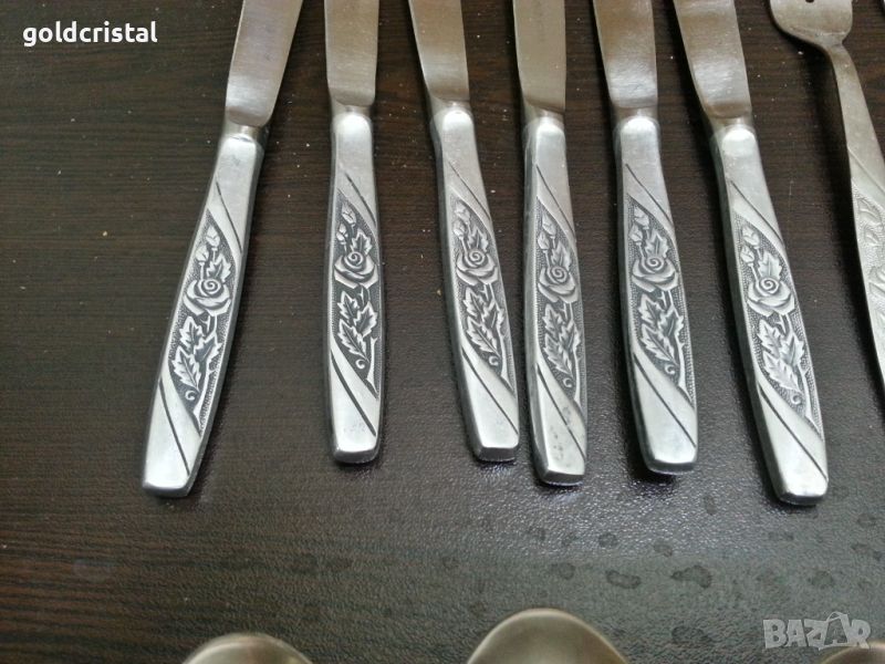 Стари руски прибори за хранене неизползвани неръждаеми 6 бр ножове 6 бр вилици 6 бр лъжици 6 бр чаени лъжички 6 бр десертни вилички едната е малко по различна неръждаеми неизползвани сервиз комплект сет лот ретро арт декор винтидж колекция стари старинни антикварни предмети обзавеждане за дома и семейството подходящи за подарък за ценители и колекционери