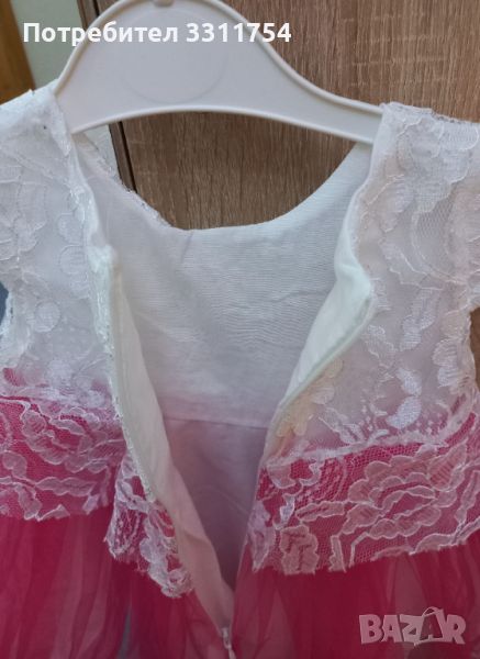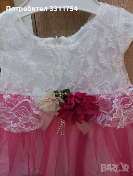 Много красива рокличка в цикламено и бяло. Няма следи от употреба като нова е, облякана е само веднъж за специален повод. Подходящ за 6-9 месеца зависи от килограмите на детето
