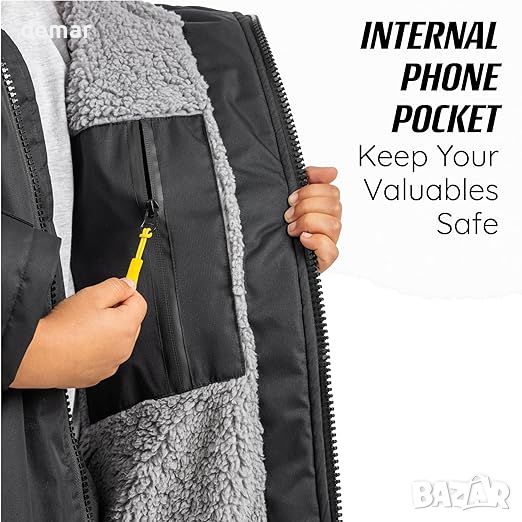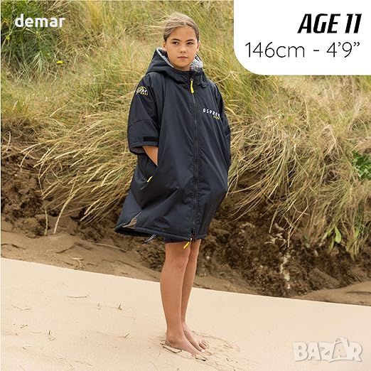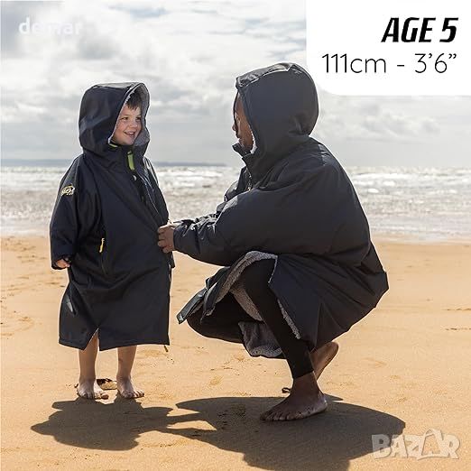 Халатът за преобличане за деца е основен избор за сърфисти, каякари, бодибордисти и плувци, като поддържа децата на възраст 6-10 години топли и сухи в студено време. Този водоустойчив и ветроустойчив халат разполага с вътрешен джоб за телефон за удобство и 3/4 ръкави за свобода на движение и комфорт. Водоустойчивият външен слой и топлата вътрешна подплата от руно Sherpa го правят идеален за всякакви дейности на открито в студено и влажно време. Висококачественият, голям дизайн позволява на децата удобно да сменят дрехи, неопренови костюми или плувни костюми в палтото за повиване с качулка. Лесно се почиства с препоръчително ръчно пране и бързо съхне за многократна употреба.
