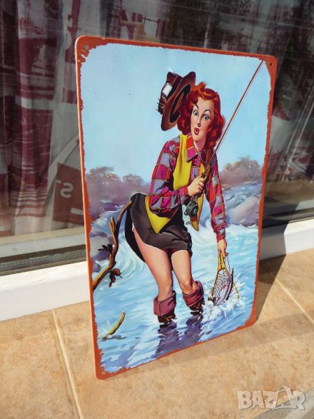 Метална ламаринена табела - Момиче лови риба.
