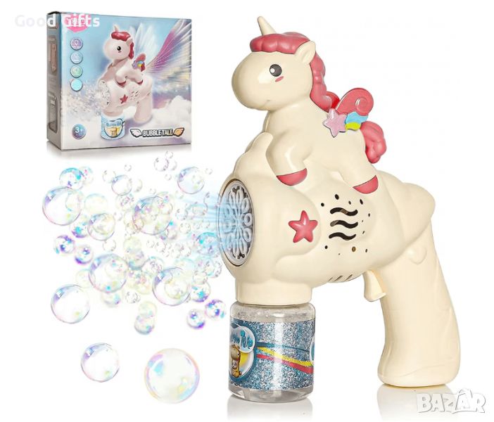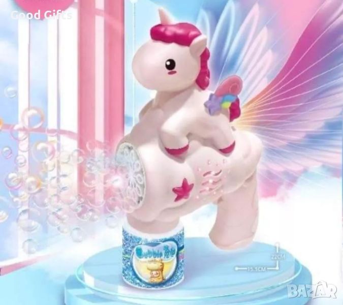 Играчката е със стилно тяло с формата на Еднорог и свети в ярки цветове, а към нея има и бутилка, пълни със сапунена течност. Специалната формула на течността я прави напълно безопасна за бебета, но в същото време мехурчетата ще излязат силни и големи и няма да се лющят във въздуха дълго време.
