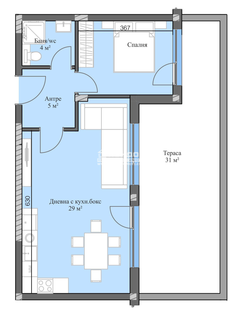 Разпределения - Просторни и много функционални апартаменти с просторни стаи и гледка към Стара планина, а също и с партерни жилища с двор и такива с големи панорамни тераси. Апартаментът, който Ви предлагаме се състои от дневна 29кв.м. с кухненски бокс и трапезария и излаз на панорамна тераса 31кв.м., една самостоятелна спалня, баня с тоалетна и входно антре.