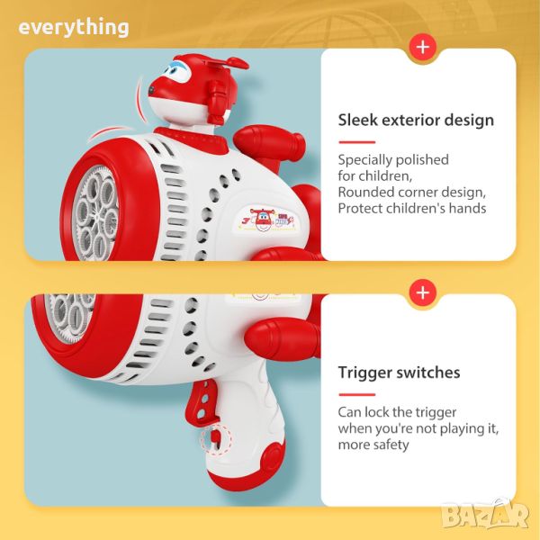 Bubble Blaster Gun: Уникална машина за издухване на балончета Super Wings. Продуктът съдържа 1 x Bubble Blaster, 100 ml разтвор за сапунени мехурчета и мини фигурка Jett.