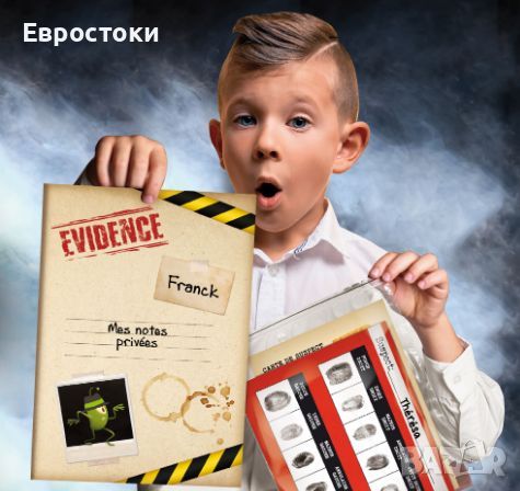 Игрален комплект на детектив включва: лупа, комплект за самоличност, черен лист за пръстови отпечатъци, талк, четка, ръкавици, железен прах, стикери за пръстови отпечатъци, мастило за пръстови отпечатъци, магическа писалка, карти за пръстови отпечатъци, инструкции ФРЕНСКИ език.