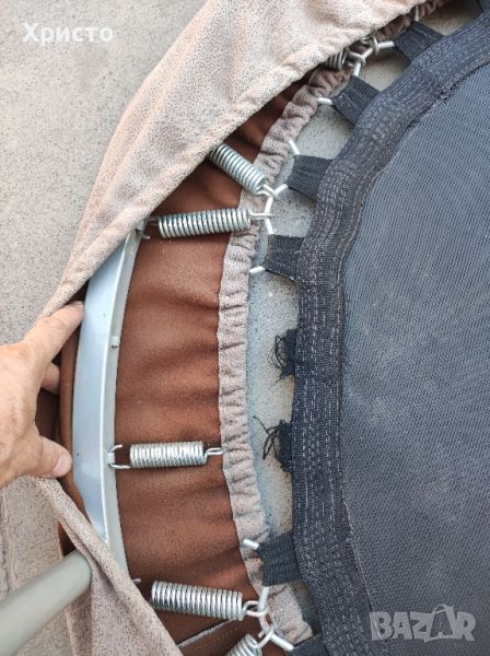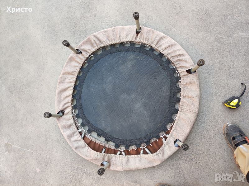 Трамплин с диаметър 1метър.Височина 20см.Има нужда от зашиване от обущар на две каишки на които да се закачи пружината видно от последната снимка.Деца до 7 години могат да го използват и в това състояние.Лично предаване БЕЗ куриер