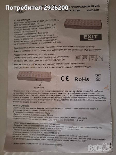 АВАРИЙНА ПРЕЗАРЕЖДАЩА ЛАМПА LED 3W → Обява 46049032
