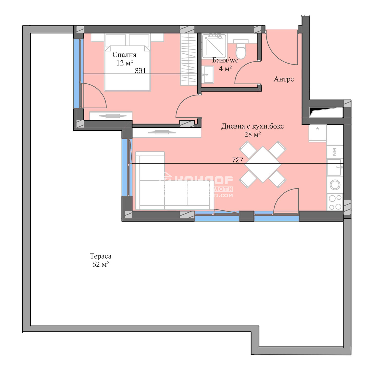 Разпределения - Просторни и много функционални апартаменти с просторни стаи и гледка към Стара планина, а също и с партерни жилища с двор и такива с големи панорамни тераси. Апартаментът, който Ви предлагаме е с изложение ЮГ/ЗАПАД, състои се от дневна 28кв.м. с кухненски бокс и трапезария и излаз на панорамна тераса 62кв.м. с достъп от двете стаи, една спалня, баня с тоалетна и входно антре.