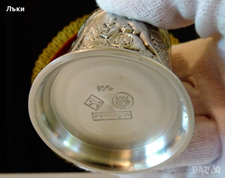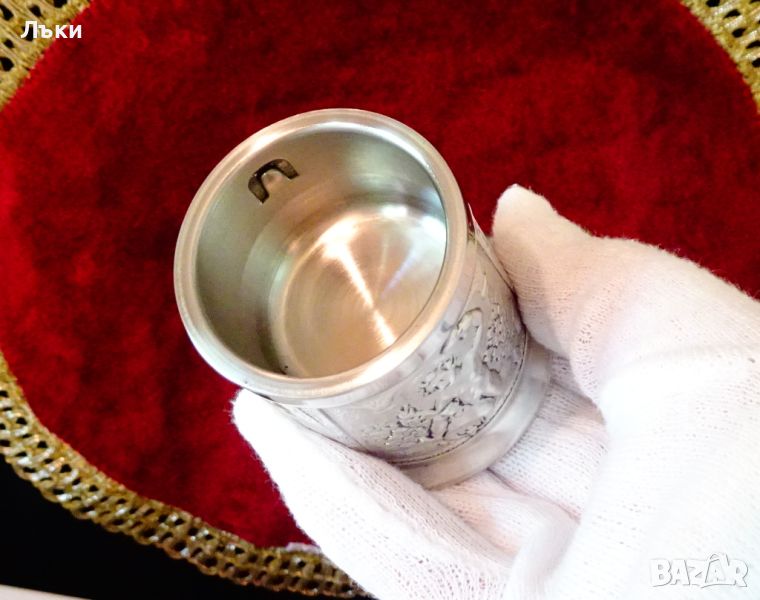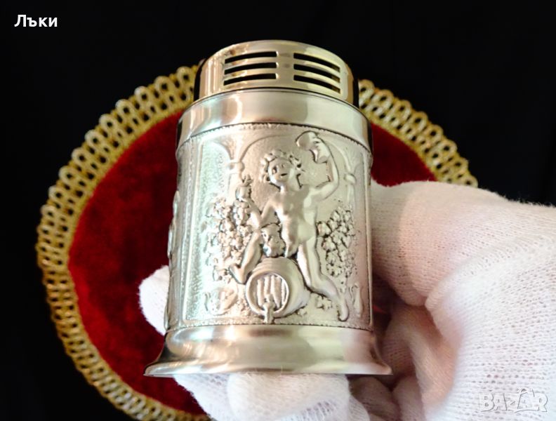 с три релефни картини – Бог Дионис или Бакхус седнал върху буре с бокал в ръка,наздравици в кръчмата и почерпка между приятели.Височина 7 см.,диаметър 5.5 см.,тегло 250 гр.