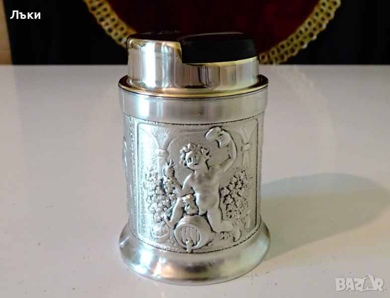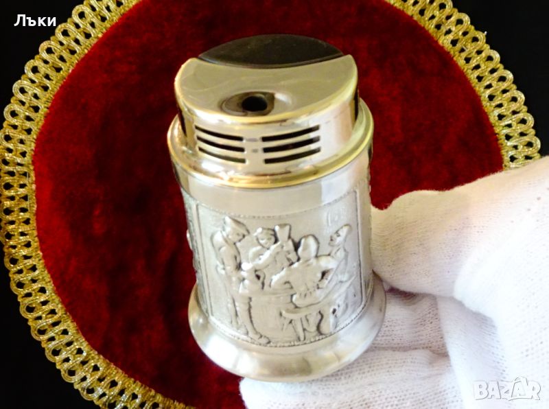 известната марка HB West-Germany.Запалката работи перфектно.Вградена на стойка,ръчно изработена от 95% калай и 5% сребро маркирана от производителя Grenningloh.Декорирана