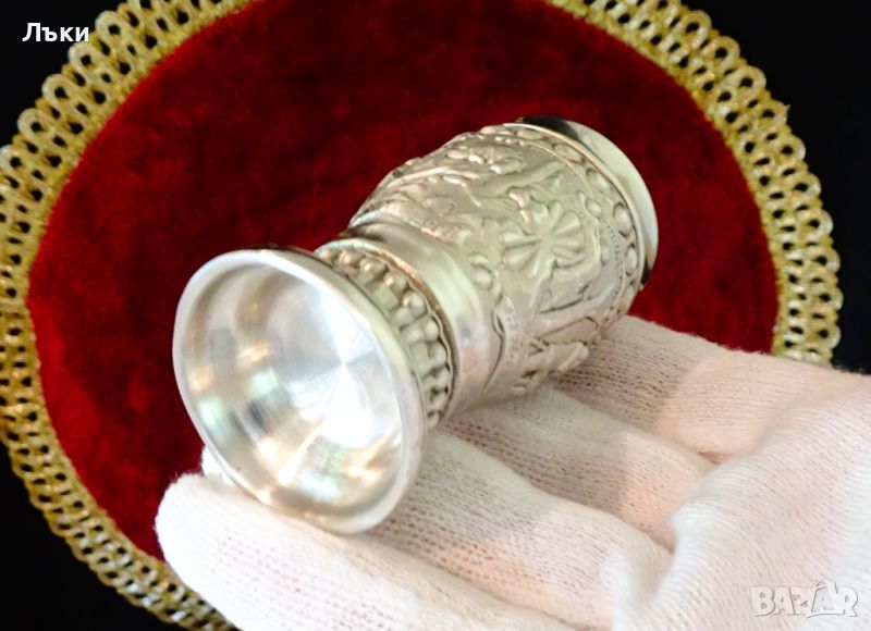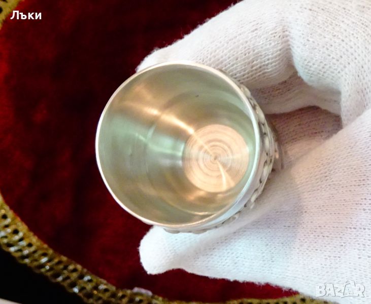 кралски бокал.Блести като сребро от вън а от вътре.Височина 6.5 см.,диаметър 4
