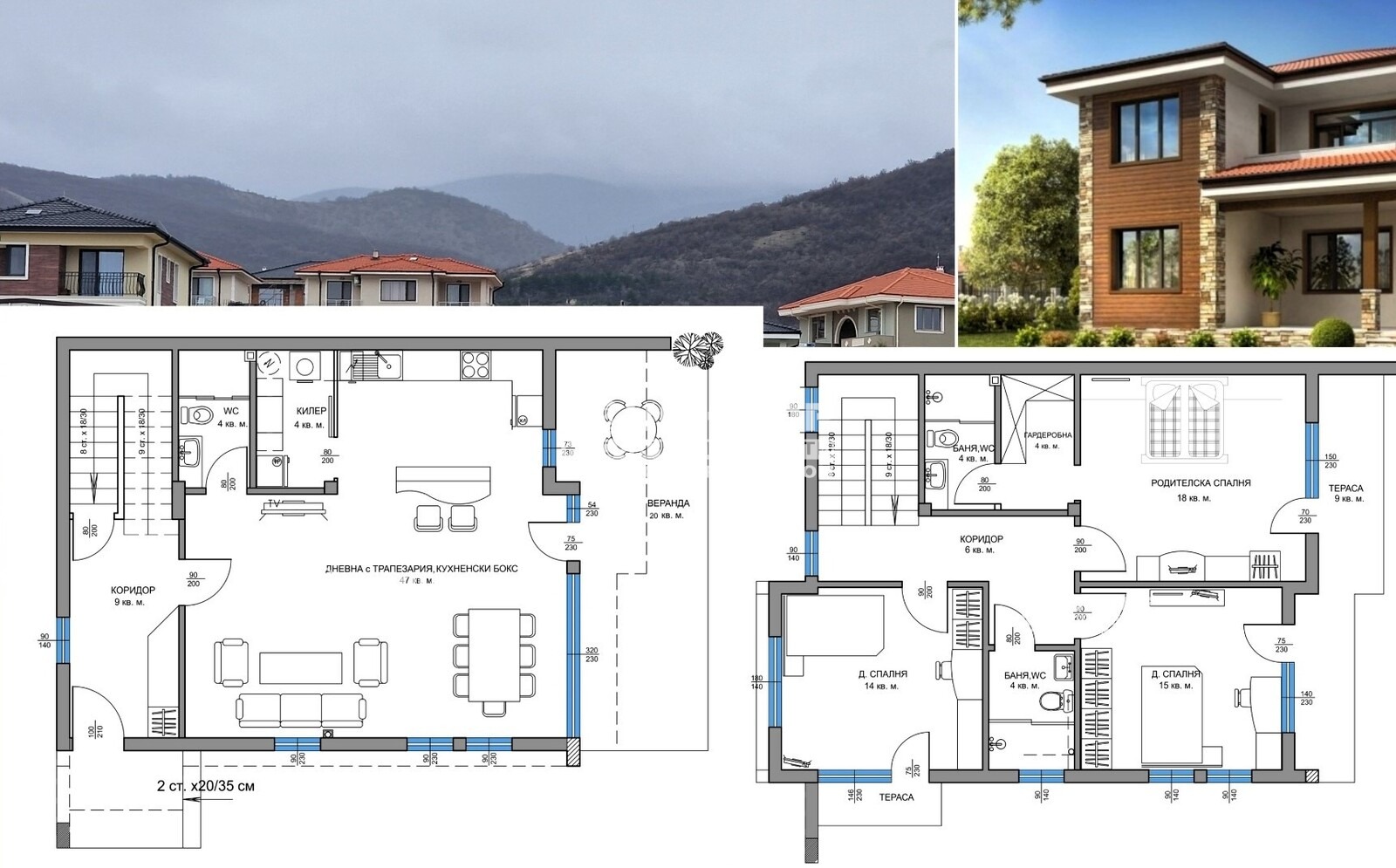 Оферта 61693: Предлагаме Ви да закупите новоизградена къща с Акт 14 , ситуирана в парцел с площ от 500кв.м. , с панорамна гледка към град Пловдив. Основните й предимства са модерната архитектура, добрата локация , лесният достъп и функционалното разпределение на жилищната площ. Къщата е с РЗП от 200 кв.м. + 20кв.м. веранда, разпределена на две нива. На първо ниво са разположени просторна и светла дневна 47.00 кв.м. с излаз на страхотна панорамна и частично покрита веранда, трапезария и кухненска част , баня с тоалетна и складово помещение , подходящо и за перално помещение. На второ ниво има три големи самостоятелни спални , като родителската е с площ от 22.00кв.м. със собствена баня с тоалетна, светъл дрешник и излаз на тераса , двете детски спални са с площ от 15.00кв.м. 14.00кв.м. и също разполагат със собствена баня с тоалетна. При изпълнението е заложено на висококачествени материали, червена Австрийска Тухла, троен стъклопакет на шест камерна дограма, 10см. външна изолация от каменна вата, изолация от фибран на плочите между етажите , изградена и оформена външна планировка. Района се оформя като квартал от новопостроени къщи. Парцела е с площ от 500кв.м. Цената включва стандартно завършване с изградена ограда на имота и завършена планировка. Паркирането е подсигурено с две удобни Паркомяста пред самата къща. Възможност за закупуване чрез Банков Кредит !!!ВИЖТЕ ОЩЕ ИЗГОДНИ ОФЕРТИ НА https://www.kondorimoti.com/ С ЕЖЕДНЕВНА АКТУАЛИЗАЦИЯ!