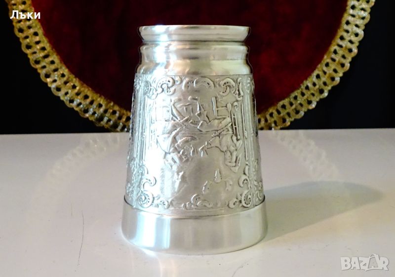 и 5% сребро,маркирана.Декорирана с релефни картини на ловна тема,разделени от