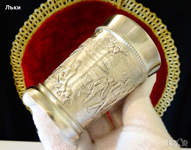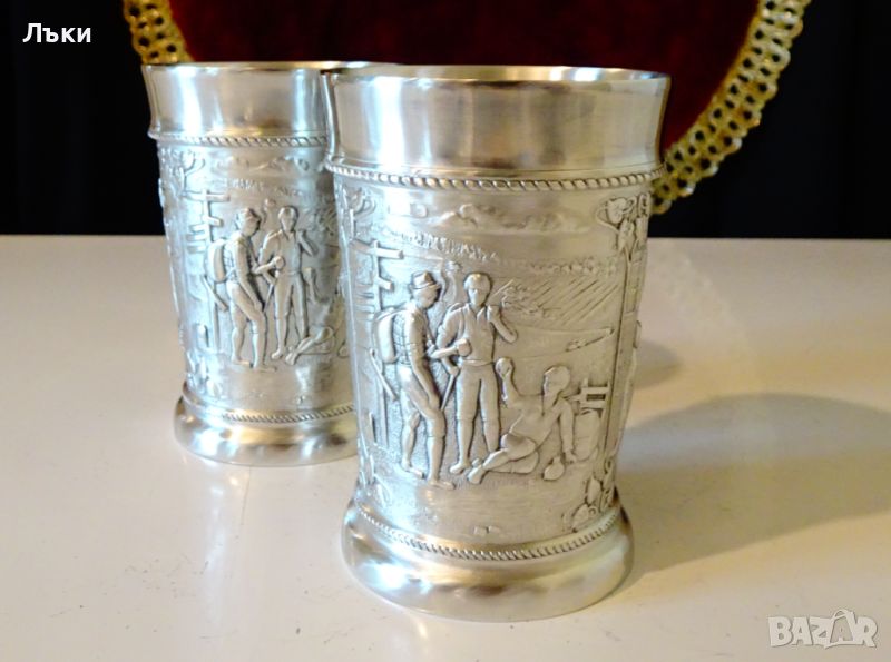 95% калай и 5% сребро, маркирани със знак за високо качество.Чашите имат три релефни картини,които представят различни моменти от туризма - семейство