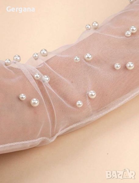 Нови, дълги тюлени дамски ръкавици в бял цвят от тюл декориран с перли в горната част (дължина: 55 см)