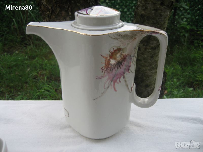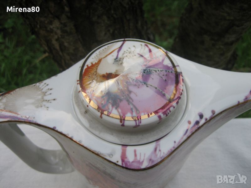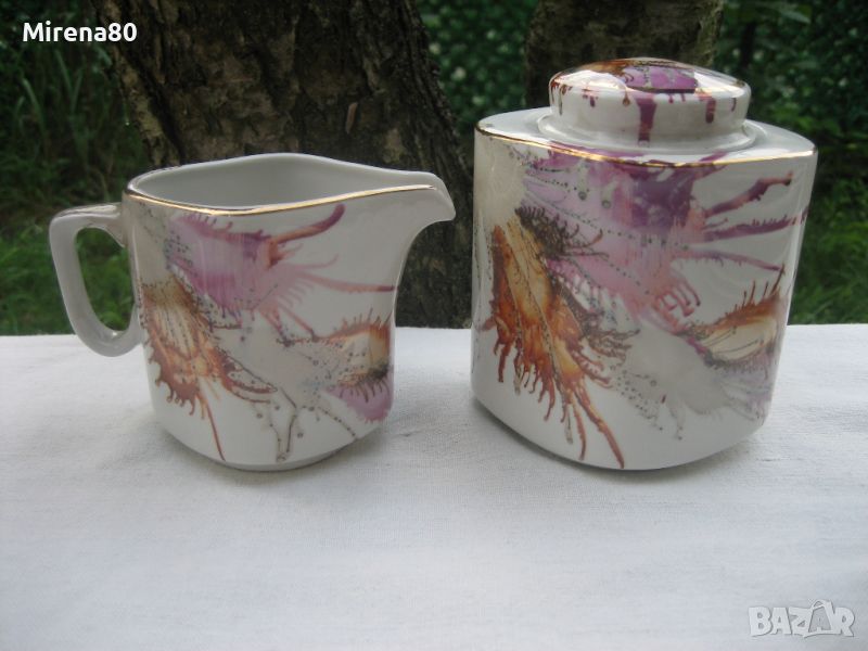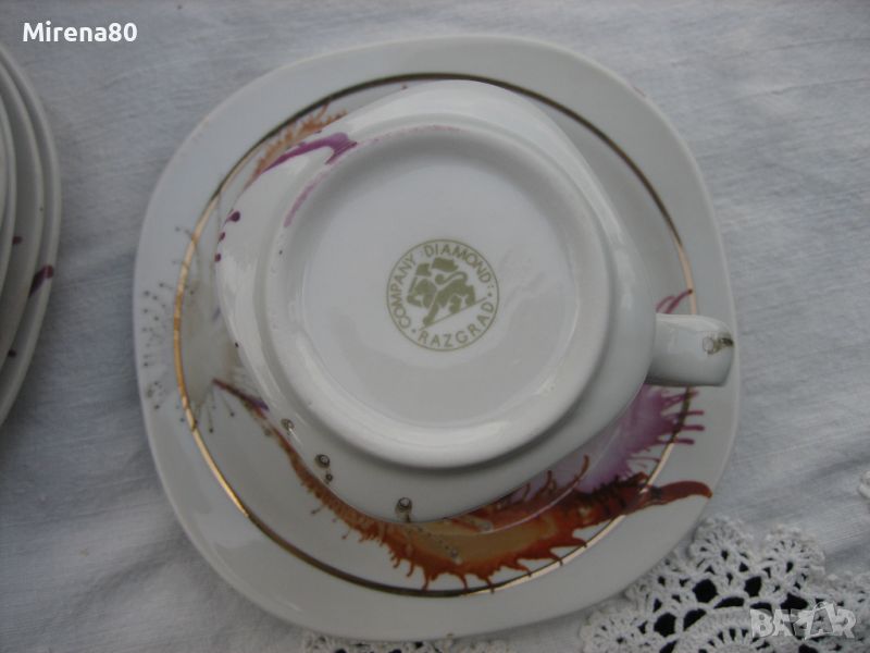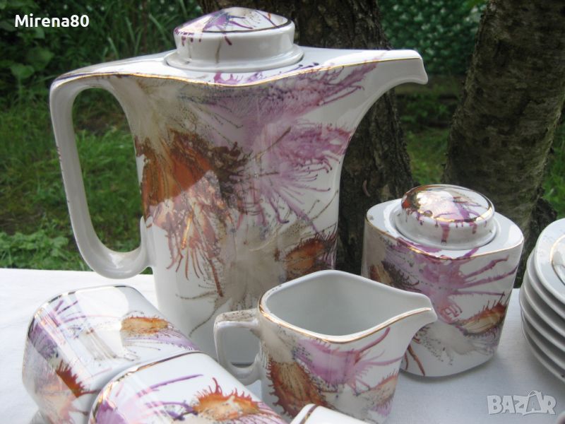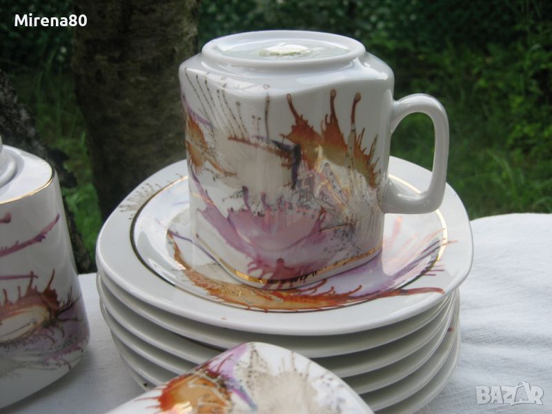 Не сервиз, а произведение на изкуството ! От фабриката ни в Разград, произведен по специална технология - чрез издухване с дюзи на различни капки боя върху порцелана. Всички части са различни и уникални, една с друга няма еднакви ! Порцеланът е лек и фин, интересна ромбоидна форма - за разлика от много други, супер удобни за употреба. Чашите са нещо, което за пръв път срещам в български сервиз - вместимост 250 мл - огромни ! С 2 думи - този сервиз е за ценители на нестандартното и различното. Неизползван.