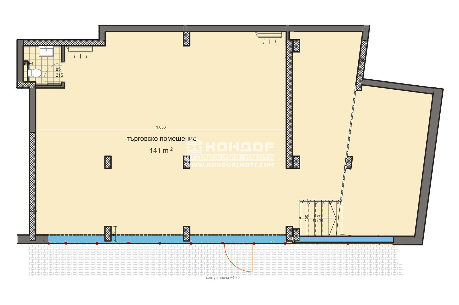 Оферта 64199: Предлагаме Ви възможността да закупите Магазин с лице към главен и оживен булевард с голяма стъклена витрина в новоизграден луксозен жилищен комплекс с модерна визия. Обекта е с лице към главен и оживен булевард с възможност за светеща реклама. Разположен е на едно ниво - партерно и се състои от търговска зала с височина 4.30м. и санитарен възел с преддверие. Магазинът е подходящ за всякакъв тип търговска дейност- магазин, салон за красота, кабинет, офис представителство и други, като има възможност за преграждане и преустройство спрямо нуждите на клиента. !!! Магазинът се издава със стандартно ниво но оборудване : подове на замазка , стени и тавани на турбозолна мазилка , пълно окабаляване и монтирана Вик инсталация. Едно от основните му предимства е страхотната локация, отлична комуникативност и динамична пътна инфраструктура, която осигурява бърз и лесен достъп до комплекса, от всяка точка на града. Изключителна съвременна архитектура и модерна технология на строителство. Има възможност за закупуване на паркомясто пред помещението!!! Гъвкави схеми на разсрочено плащане спрямо възможностите на клиента в рамките на строителството или закупуване чрез Банков Кредит, на изключително изгодни условия за клиенти на агенцията !!!