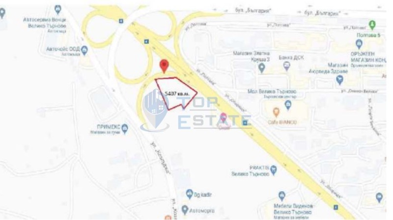 Топ Естейт Недвижими имоти Ви предлага поземлен имот с площ от 5407 кв. м., с опция за закупуване на още три съседни парцела с обща площ от 20 000 кв.м. Поземления имот е разположен в началото на гр. Велико Търново, на самия път София - Варна (западен пътен възел в границите на града) с лице на асфалтов път около 250 метра . Поради добрата си локация, имота е подходящ за изграждане на складови, търговски сгради, хипермаркет, търговия на едро и други търговски дейности. Номер на оферта: 2568. We speak English and German.
