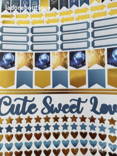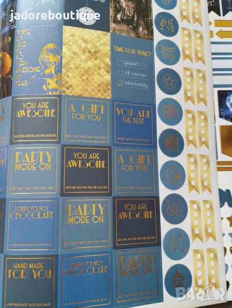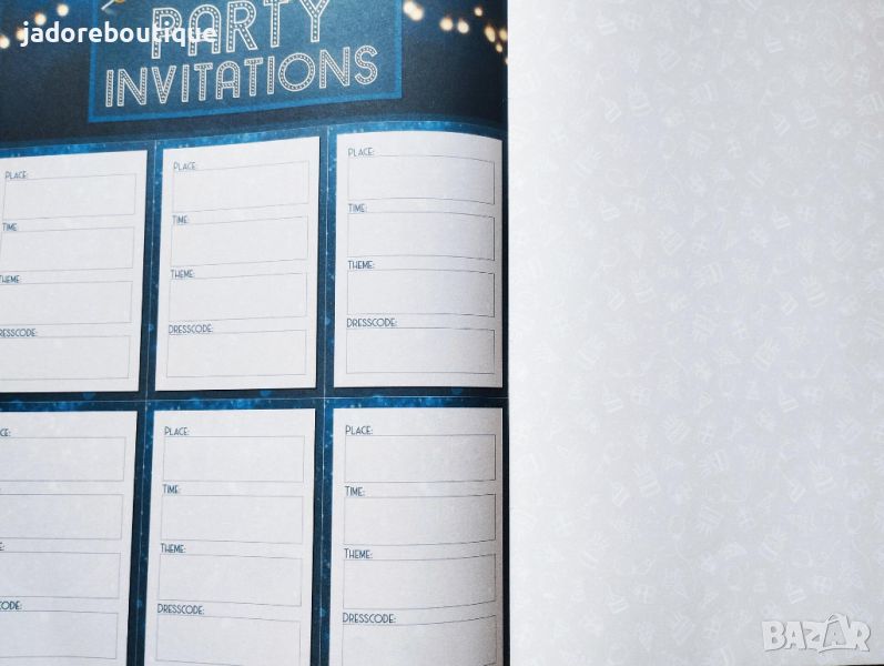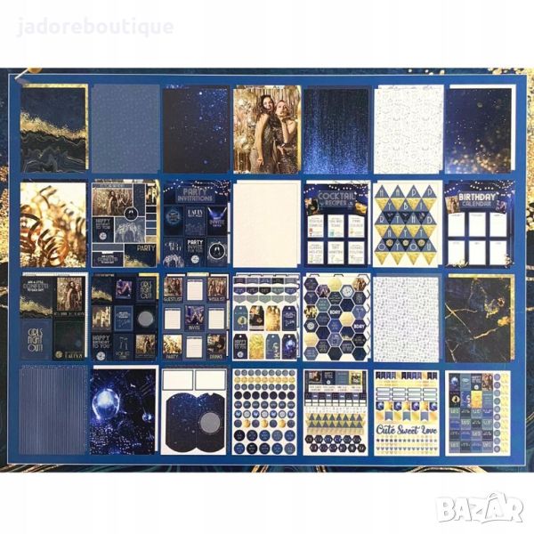 Комплекта съдържа шарени листи за декорация; 6 листа картички от твърд картон различни видове и размери; 4 листа тагчета от твърд картон различни видове и размери; 4 листа стикери различни видове и размери; парти покани; годишен календар за рождени дни и други крафт листи.