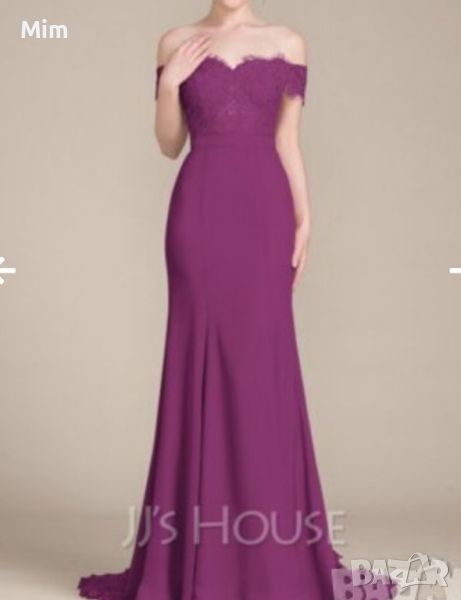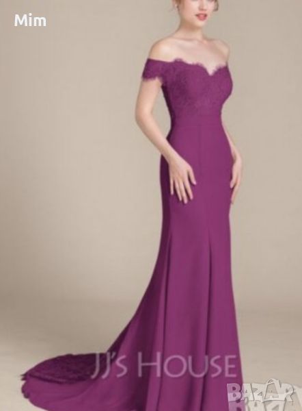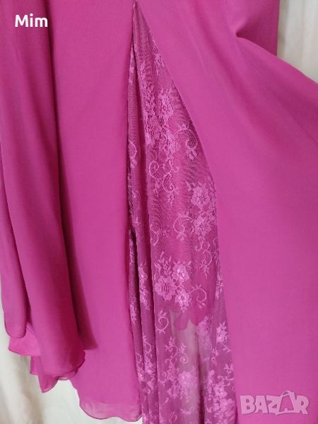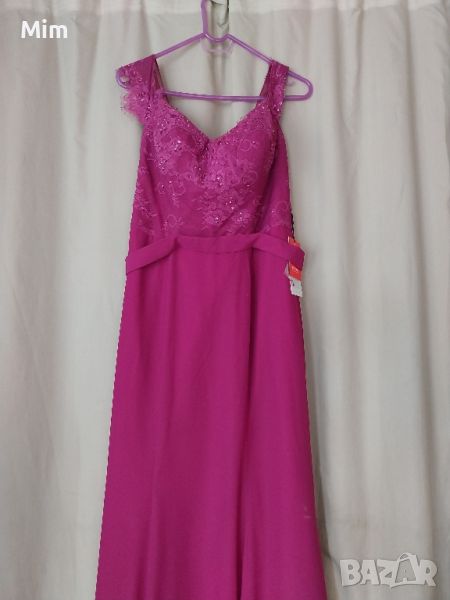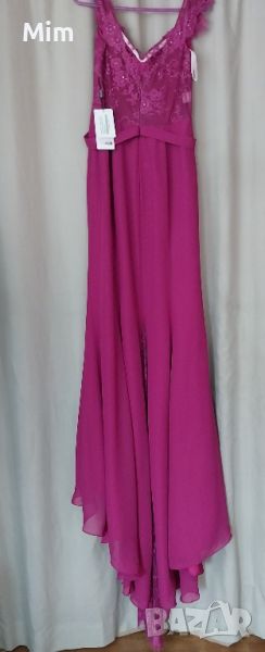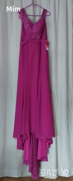 Официална рокля бордо с паднал ръкав ,шлеифа е с дантела както и на бюста и с камъчета.Бюста е с твърда чашка, закопчаването е с цип отзад. Нова с хартиен носител по етикет е XL Гръдна 47 до 51 см ,подгръдна 42 до 45 см едностранно, надолу се разширява дължина 150 до 200 см .