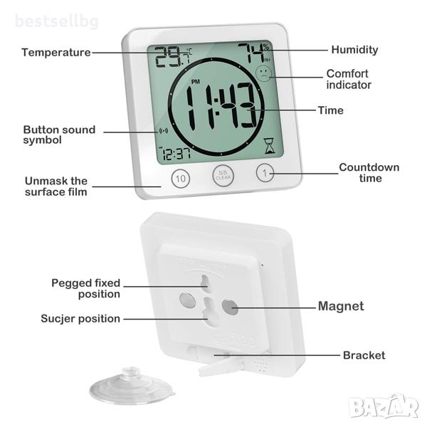 Функции: Таймер, термометър, хигрометър, аларма, функция за обратно броене
