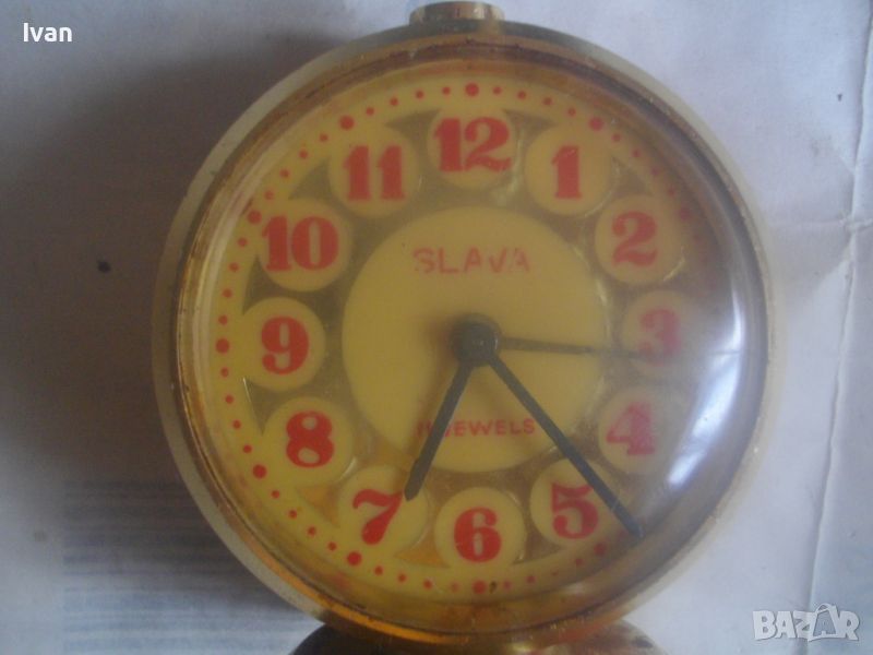 Червен малък будилник - SLAVA 11 JEWELS - Made in USSR - 11 камъка. Много запазен външшен вид, с оригиналната боя, без надрасквания по нея, оригинално здраво стъкло. Не работи - навива се, но не тръгва. Лпсващо кроглото капаче отгоре на будилника за спиране на звъненето.