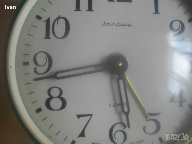 Зелен голям будилик - JANTAR 4 WELELS - Made in USSR - 4 камъка. Запазен външен вид, не се навива. Здраво стъкло оригинално. Всички части налични, пружина скъсана. Диаметър стъкло ф 110мм. Височина на будилника - 160 мм, с 2 камбани.