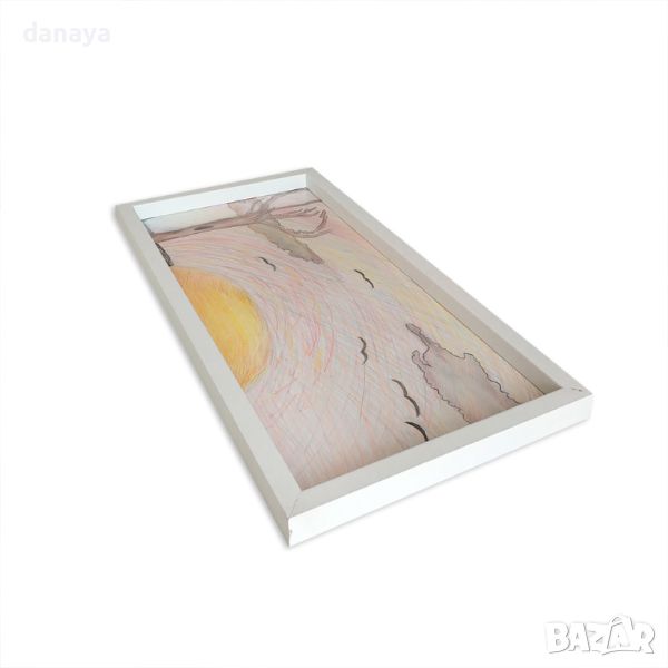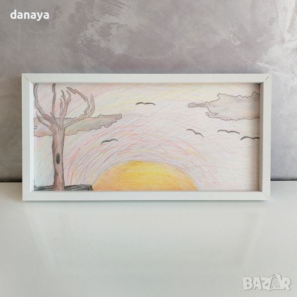 Ръчно рисувана картина “Залез”. Картината е поместена в бяла дървена рамка с размери: 45см х 23см.