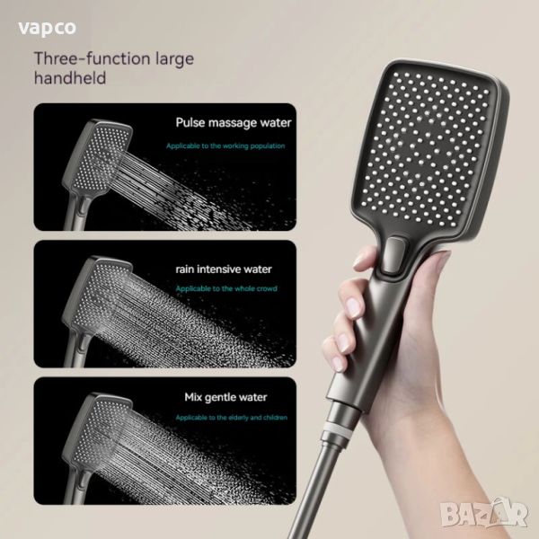 - Ръчен душ с възможност за регулиране на височината и ъгъла и три режима на работа и бутон за превключване между тях