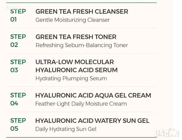 Този комплект за пътуване от Isntree се грижи за всички ваши нужди за грижа за кожата за следващото ви бягство! Комплектът се състои от пет от бестселърите на марката в мини размери, включително Green Tea Fresh Cleanser, Green Tea Fresh Toner, Ultra-Low Molecular Hyaluronic Acid Serum и Hyaluronic Acid Aqua Gel Cream. Той също така включва водния слънцезащитен гел с хиалуронова киселина, който предпазва кожата от ултравиолетовите лъчи, като същевременно овлажнява кожата и оставя блестящ завършек. Продуктите идват с малка торбичка.Този комплект за пътуване включва: Green Tea Fresh Cleanser 20 мл Green Tea Fresh Toner 20 мл Серум с ултра ниско молекулна хиалуронова киселина 20 мл Аква гел крем с хиалуронова киселина 20 мл Воден слънцезащитен гел с хиалуронова киселина 10 мл Свеж почистващ препарат със зелен чай: Почистващ гел със слабо дразнещо действие, формулиран с екстракт от зелен чай, произхождащ от Джеджу, за почистване и освежаване на кожата, без да я лишава от влага. Съдържа 4 вида хиалуронова киселина, за да поддържа вашата гладка, еластична и хидратирана. Помага за премахване на излишния себум, като същевременно подобрява текстурата на кожата. Свеж тонер със зелен чай: Обогатен с 80% екстракт от зелен чай от остров Чеджу за успокояване и съживяване на уморената кожа. Формулиран с Anti Sebum P (HD) за абсорбиране на излишния себум за чиста кожа. Дерматологично тестван и подходящ за мазна или комбинирана кожа. Серум с ултра ниско молекулна хиалуронова киселина: Лек, веган серум с хиалуронова киселина, напоен с дълбока морска вода от остров Ulleung, Корея, който дълбоко хидратира и успокоява кожата. Формулиран с 14 вида хиалуронова киселина, за да задържи влагата в кожата за дълго време. Съдържа глицерил глюкозид за активиране на водните канали, доставя богата влага на кожата и бета-глюкан за укрепване на бариерата срещу влага. Аква гел крем с хиалуронова киселина: Обогатена с 5 вида концентрирани хиалуронови киселини, за да осигури интензивна хидратация на вашата кожа. Формулиран с ботанически сквален, извлечен от маслиново масло за усъвършенстване на текстурата на кожата, сок от листа от алое вера за успокояване на раздразнената кожа и натриев PCA за предотвратяване на сухотата на кожата. С гелообразна текстура, която хидратира и омекотява сухата кожа. Дерматологично тестван и подходящ за мазна или комбинирана кожа. Воден слънцезащитен гел с хиалуронова киселина: С широк спектър от SPF50+ PA++++ за блокиране на вредните UV лъчи. Обогатен с активни, естествено извлечени съставки за овлажняване и успокояване на раздразнената кожа. Съдържа хиалуронова киселина за овлажняване на кожата, астаксантин за подобряване на еластичността на кожата и серамид за възстановяване на влагата в кожата. Обогатен с екстракт от Centella Asiatica за успокояване на раздразнената кожа и екстракт от плод на смокиня за омекотяване на текстурата на кожата. Как да използвам: 1. Вземете умерено количество Cleanser и разпенете, масажирайте лицето нежно с богата пяна и изплакнете обилно с хладка вода. 2. След почистване нанесете умерено количество тоник, серум, гел крем и потупайте леко за по-добро усвояване. 3. В последната стъпка от рутинната грижа за кожата нанесете умерено количество слънцезащитен гел върху цялото лице и нежно потупвайте за по-добро усвояване.