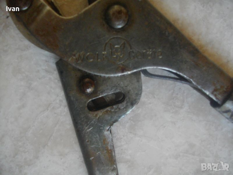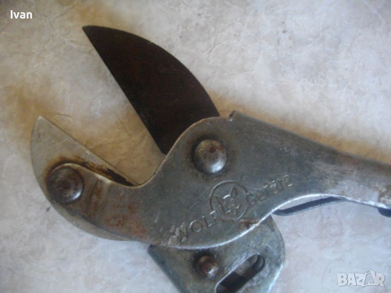 ОПИСАНИЕ НА МАЛКА ножица немска профи. Марка/лого WOLF CRAFT. Дължина ножица 155 мм, дължина острие - 1 бр- 45 мм, другата челюст е тип наковалня /без острие.Едната дръжка е подсилена фабрично и удължена с масивна тръба - обща дължина с нея - 400 мм, дължина подсилване с тръба - 290 мм. Челюстта на главата с отрието отваря до 25 мм. Ножицата е стомана изцяло. Има възратен лостов механизъм за разтваряне при работа. Цена ножица - 79 лв. Твърда цена.