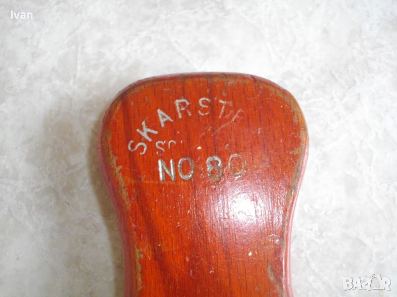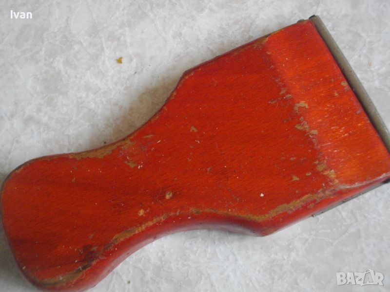 Скрепера е в почти нов, в отлично работно и визуално състояние. Отлично състояние на стържещият нож, без никакви наранявания по острието. Острие - сменяемо. Ширина нож/ширина работна на стържене - 80 мм. Дължина на скрепера - 180 мм, ширина - 80 мм, удобна дръжка за захват на ръката пр работа. Дръжка - буково дърво, боядисано в оригиналната си червена боя.