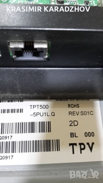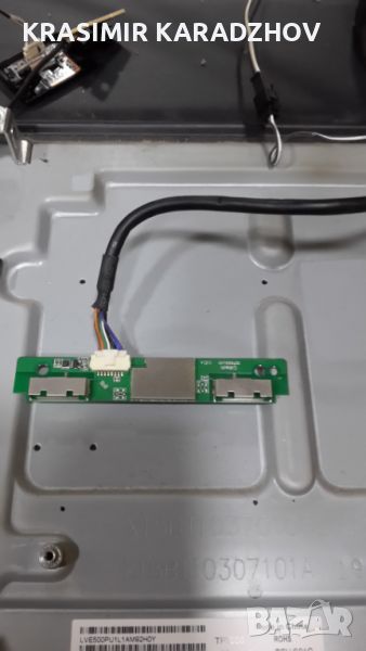 Панел TPT 500 - 5PU1L.Q REV : S01C със счупена матрица Подсветка в комплект с тавата ------80.00 лв Майн борд 715G9907-M01-B03-005G -------- 110.00 лв Захранващ борд 715GA052-P01-000-003H -------50.00 лв T-con CCPD-TC495-002 v1.0 ---------40.00 лв Тонколони 4ом 11W --------30.00 лв Wi-Fi модул ---------20.00 лв IR приемник +бутон -------20.00 лв Крачета комплект ------ 20.00 лв От днес 10 % намаление