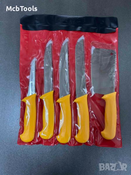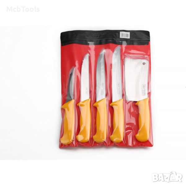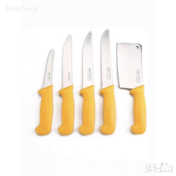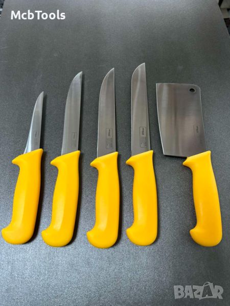 Комплект касапски ножове подходящи за транжиране, рязане на зеленчуци, месо и други. Изработени от неръждаема стомана с тройно заточено острие. Подходящи за професионална употреба. Комплектът съдържа нож за обезкостяване, дране, колене, рязане + сатър.