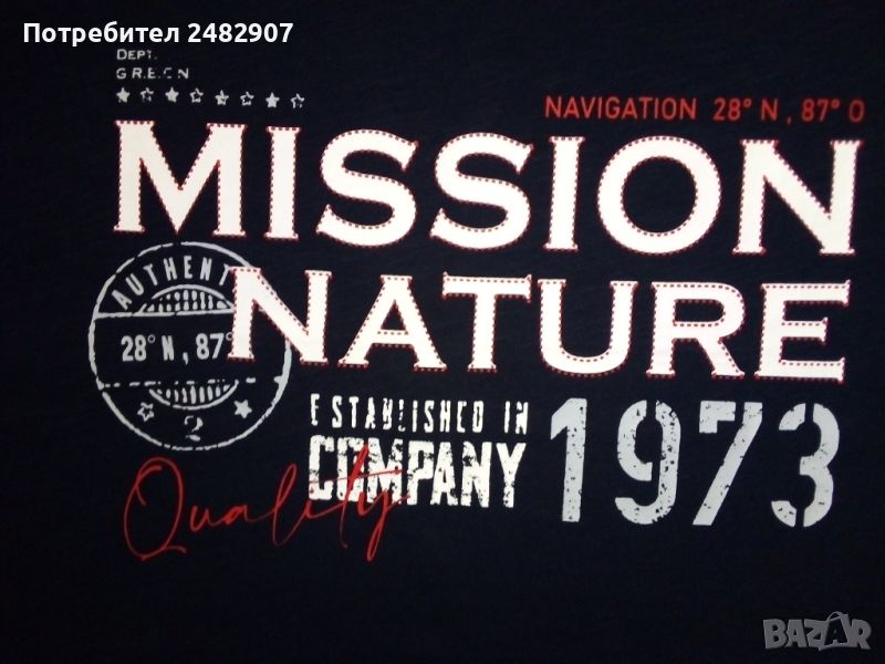 Тъмно синя мъжка тениска, с щампа 100 % памук, размер М. Ширина в раменете - 47 см, ширина под мишниците - 55 см, ширина в долната част - 55 см, дължина от рамото до долу - 74 см, дължина на ръкава от рамото - 21,5 см, ширина на ръкава в долната част - 18 см. Чисто нова, не е използвана.