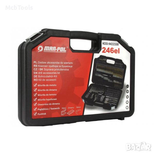 Комплектът консумативи от 246 части на Mar-Pol съдържа пълен набор от накрайници за винтоверт и свредла за пробиване в дърво, метал и зидария. Доставя се в луксозен пластмасов куфар за пренос и съхранение.