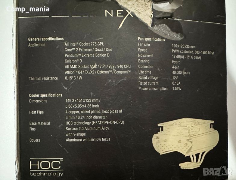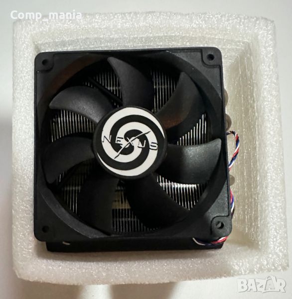 - Под Nexus HOC-9000 има добър просвет от 47 мм за неща като радиатори на чипсет и RAM. Четирите топлинни тръби с диаметър 8 mm са никелирани и правят четири извивки, преди да влязат в алуминиевите ребра. Големи екструдирани алуминиеви секции са монтирани от двете страни на Nexus HOC-9000, те помагат за насочване на въздушния поток надолу и могат да бъдат украсени с доставените стикери. Разрезите в алуминиевата основа са за монтажната скоба на AMD. Височината на радиатора е 128 мм.