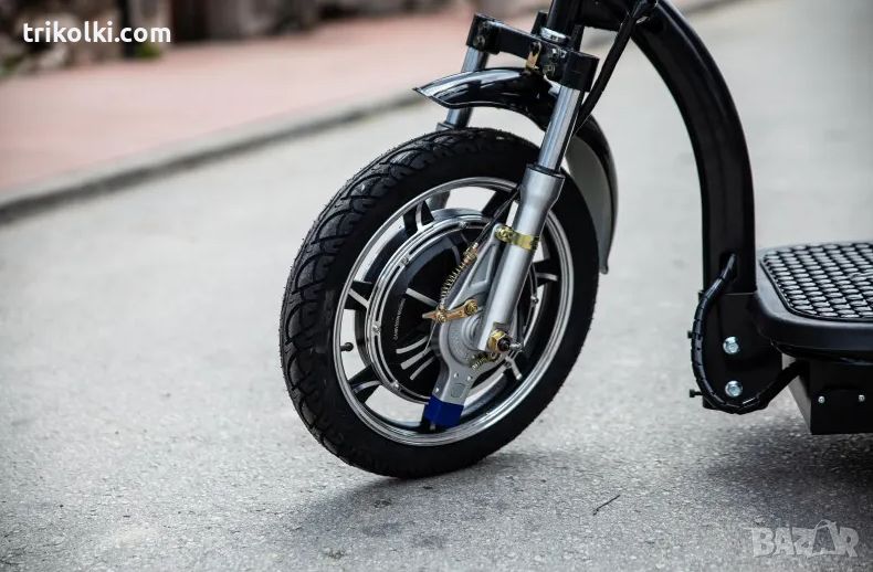 Благодарение на дългогодишния ни опит в работата с ел. превозни средства моделът, който ви предлагаме е оптимизиран за безпроблемно ползване, както за лично, така и за отдаване под наем. Фабрично повдигната рамка, високи и широки задни гуми. Задвижващото предно колело, което е най-големият размер, за по голяма стабилност и контрол. Допълнителен ключ с подсветка за механично заключване на мотора. Задните колелета са с размер 12.5 цола, като и двете са оборудвани с дискова крачна спирачка. Кормилната рамка е подсилена, кормилото е по-широко, за по-удобно захващане. Има удобна широка седалки с висока облегалка.