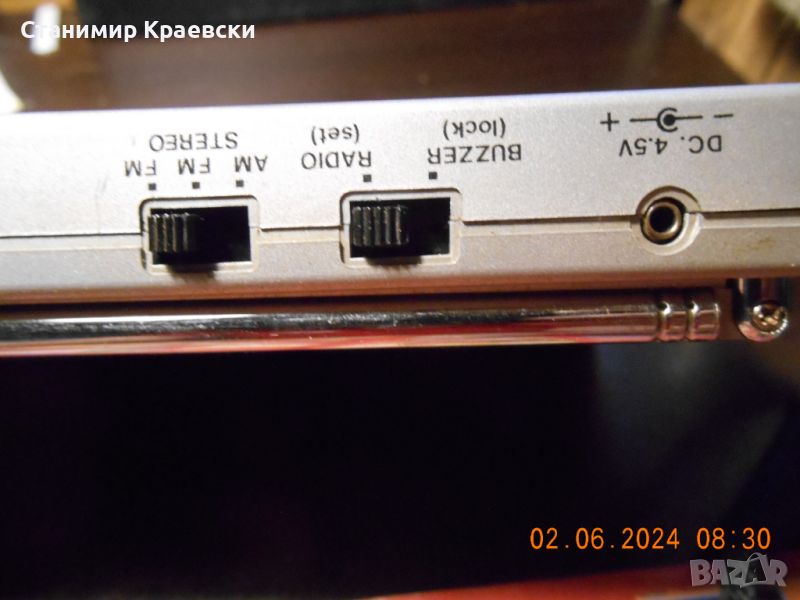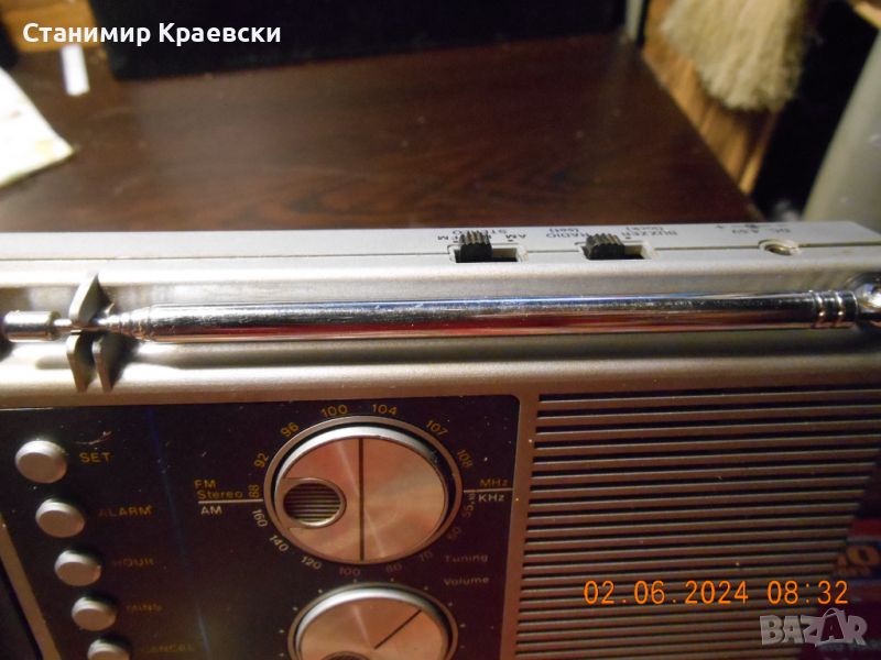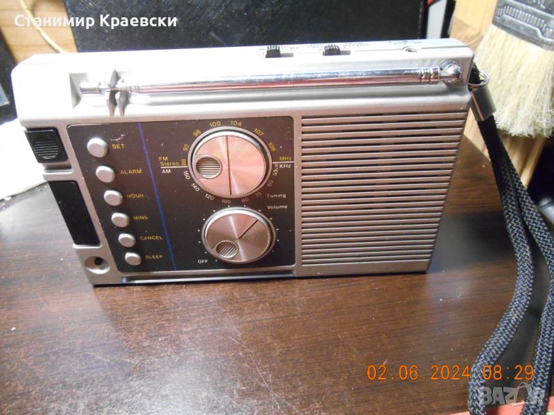 Портативен радиочасовник на 43 г и в добър запазен вид .Всичко работи по него .Осветление на екрана .Здрава антена .Дръжка за носене.Работи с 3 бат АА за радио + 1 бат АА за часовника Всички копчета са наред